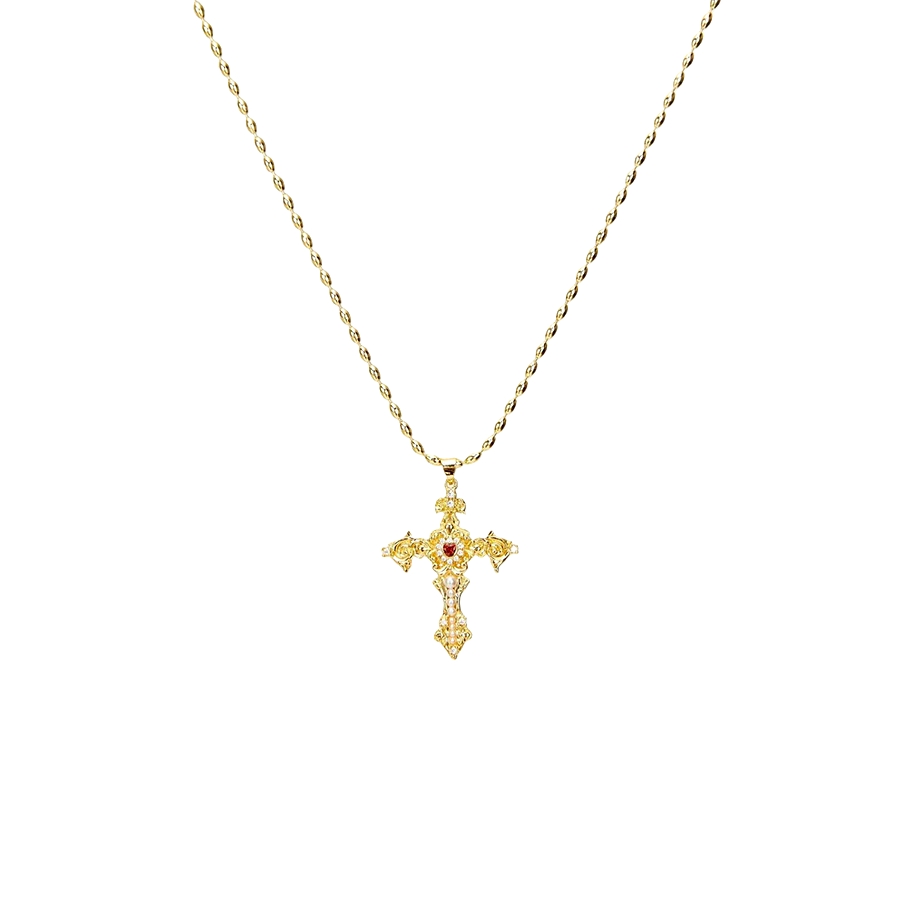 A vintage-gold cross necklace with CZ sparkle and a bold red center—made to stand out in photos and real life.