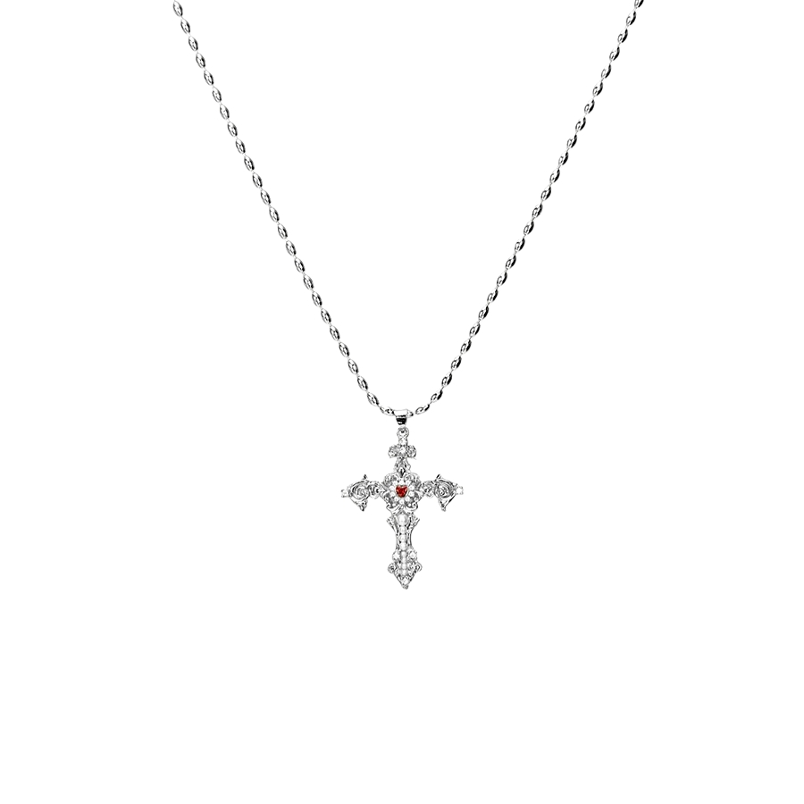 A platinum-shine gothic cross necklace with CZ sparkle and a red center—made for daily stacking and viral outfit pics.