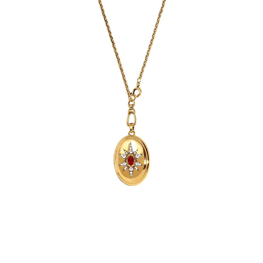 We craft the Clara photo locket necklace from brass and add 18K gold plating for a rich tone. We set Swarovski crystal and artificial crystal accents to create a bright starburst effect. Also, the locket opens smoothly, so you can add or swap a photo with less effort. In addition, the oval profile looks clean on camera. That’s why it works for both everyday wear and special events.