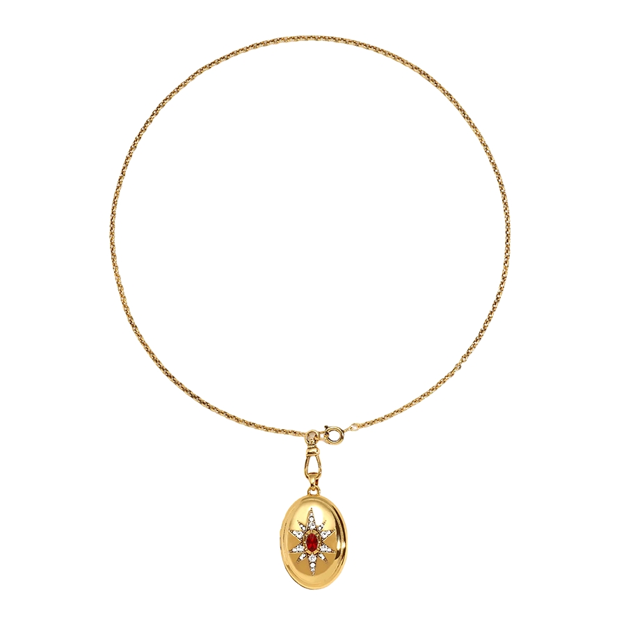 This gold clara openable locket clasp chain necklace is designed to look classic and feel current. Since the oval locket features a starburst center with a red gemstone pop, it stands out while staying easy to wear. At the same time, the clean gold tone keeps it versatile for daily outfits. For example, wear it solo for a quiet-luxury look, or layer it with a choker for a TikTok-ready stack. As a result, it fits content shoots, brunch, weddings, and travel outfits.