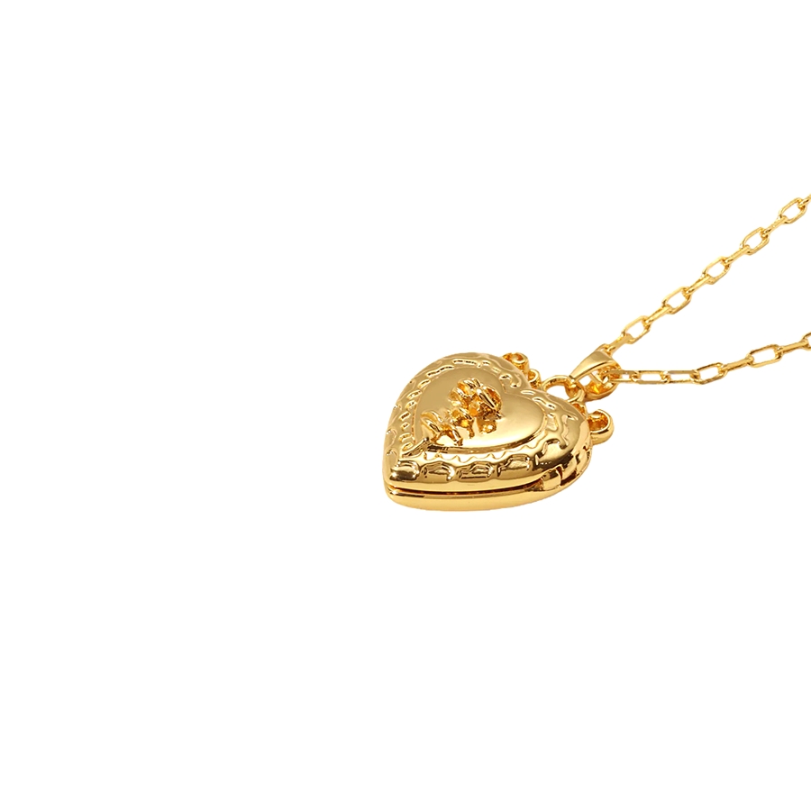 Isabela Photo Locket Necklace gold heart locket pendant with embossed floral front, white background
