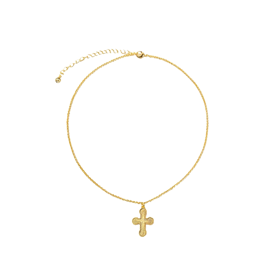 We make this 18k gold plated cross pendant necklace in 18k gold plated brass, and we add a textured cross surface for extra shine. Then we polish the pendant edges, so it looks smooth and refined. Also, the cable chain stays minimal, yet the pendant still stands out.