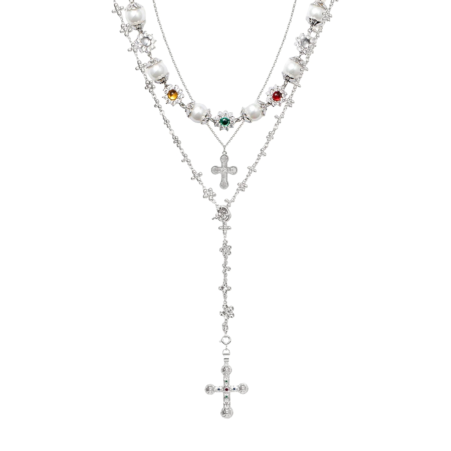Rhodium-plated brass creates a bright silver finish; also, it keeps the look polished. CZ stones add clean sparkle; meanwhile, glass pearls bring a smooth glow. Color accents add dimension; consequently, the silver layered necklace set with mini cross looks detailed up close. The layered design adds depth; yet, it still styles easily.